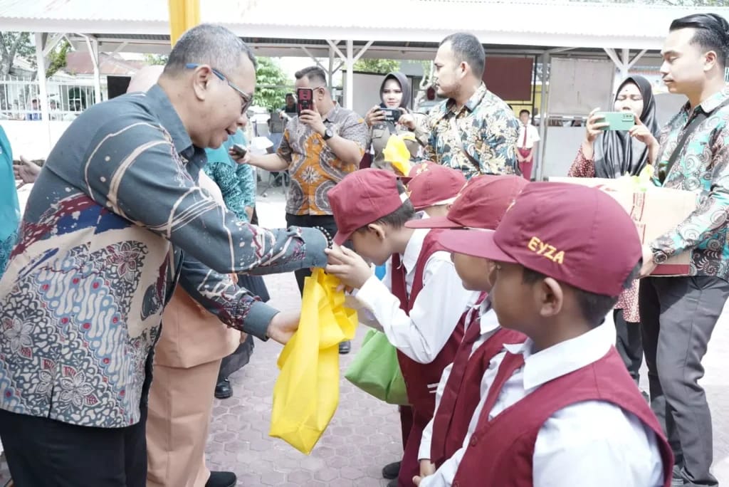 VIRAL24.CO.ID – ASAHAN – Sebanyak 500 Anak Sekolah Dasar (SD) yang terdiri dari 400 Anak SDN 010086 Selawan dan 100 Anak SDN 010099 Selawan diberikan makan tambahan oleh Bupati Asahan melalui Staf Ahli Bupati Asahan Elfina br Tarigan, MKT di SDN 010086 Selawan, Kamis (14/12/2023). Pemberian Makan Tambahan Anak Sekolah (PMT-AS) ini merupakan, kegiatan pemberian makanan kepada peserta didik Sekolah Dasar dalam bentuk kudapan yang aman dan bergizi, dengan memperhatikan aspek mutu dan keamanan pangan karena gizi merupakan salah satu factor penentu keberhasilan tumbuh kembangnya anak secara optimal. Ini disampaikan Kepala Dinas Ketahanan Pangan H. Ali Mughofar, S.Sos, MAP saat menyampaikan laporannya dihadapan Staf Ahli Bupati Asahan, mewakili Dandim 0208/Asahan, OPD, Lurah Selawan, Kepala Sekolah UPTD SDN 010086 Selawan, Kepala UPTD SDN 010099 Selawan, Ketua DWP Kabupaten Asahan beserta pengurus, Pengurus TP PKK Kabupaten Asahan, para siswa dan tamu undangan lainnya.
