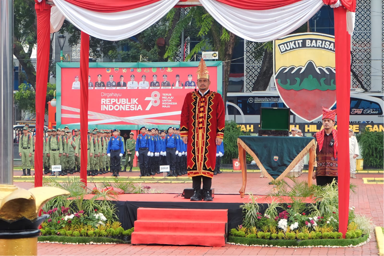 VIRAL24.CO.ID – MEDAN – Saat menjadi inspektur upacara Pengibaran Bendera Sang Saka Merah Putih Dalam rangka HUT ke-78 Kemerdekaan RI di Lapangan Benteng Medan, Kamis (17/8), Wali Kota Medan Bobby Nasution mengenakan pakaian adat Nias. Sementara itu Wakil Wali Kota H Aulia Rachman mengenakan pakaian adat Aceh, sedangkan Ketua TP PKK Kota Medan Ny Kahiyang Ayu mengenakan pakaian adat Melayu.