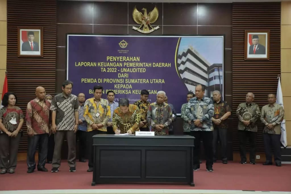 VIRAL24.CO.ID – ASAHAN – Pemerintah Kabupaten Asahan menyerahkan Laporan Keuangan Pemerintah Daerah (LKPD) Unaudited Tahun Anggaran 2022 kepada Badan Pemeriksa Keuangan (BPK) Perwakilan Sumatera Utara. Kegiatan tersebut dilaksanakan di Auditorium BPK RI Perwakilan Provinsi Sumatera Utara Jalan Imam Bonjol Medan, Jum’at (10/03/2023). Laporan Keuangan Unaudited Tahun 2022 Pemerintah Kabupaten Asahan tersebut diserahkan langsung oleh Bupati Asahan H. Surya, BSc dan diterima langsung Kepala perwakilan BPK Sumatera Utara Eydu Oktain Panjaitan SE MM Ak CA CSFA.