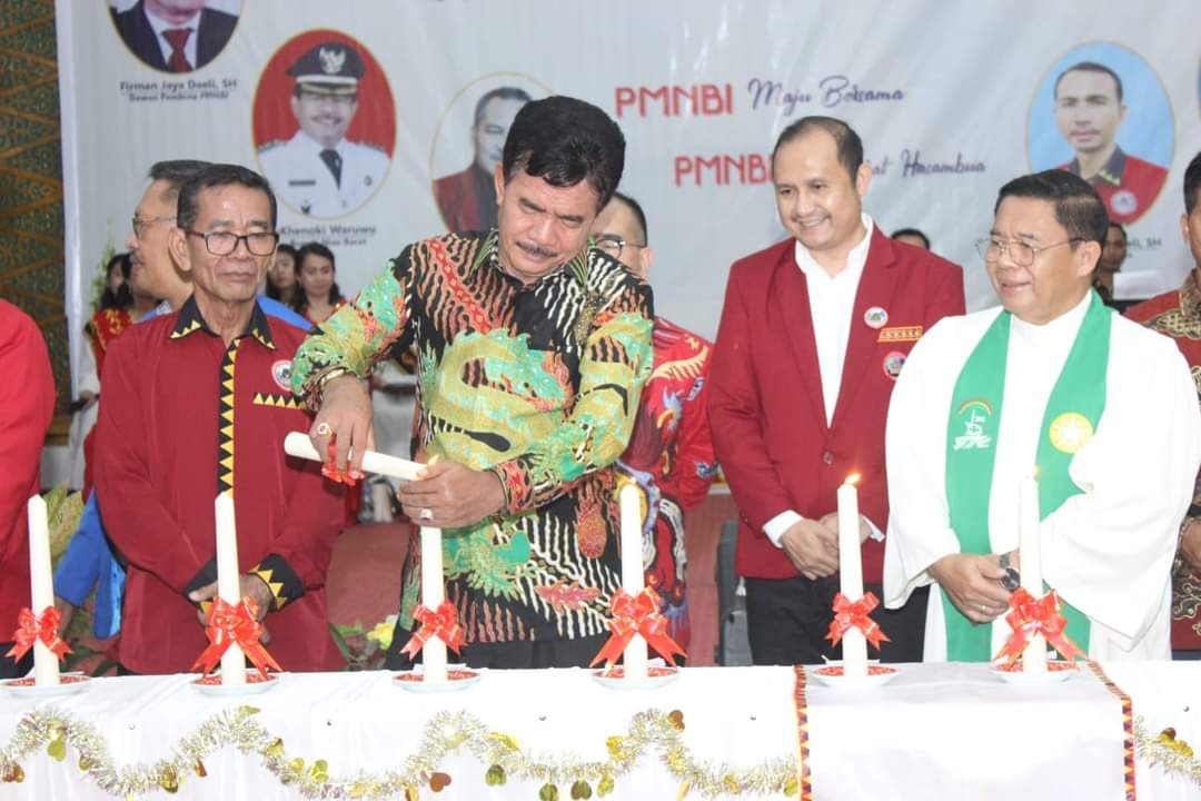 VIRAL24.CO.ID – PELALAWAN – Bupati Nias Barat Khenoki Waruwu pbersama Ibu Erli Tasar Khenoki Waruwu dan beberapa Kepala Perangkat Daerah serta Pejabat Administrator lingkup Pemerintah Kabupaten Nias Barat menghadiri acara Perayaan Natal, Syukuran Tahun Baru dan Pelantikan DPC PMNBI Kabupaten Pelalawan Provinsi Riau yang dilaksanakan di Gedung Daerah Datuk Laksmana Kabupaten Pelalawan, Minggu (22/1/2023).