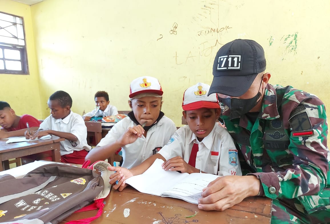 VIRAL24.CO.ID – JAYAPURA – Mendukung Pemerintah dalam mencerdaskan anak-anak bangsa di perbatasan, personel Pos Muara Tami Satgas Pamtas RI-PNG Yonif 711/Rks membantu mengajar di SD Inpres Skouw Sae Desa Skouw Sae,Distrik Muara Tami Kota Jayapura.