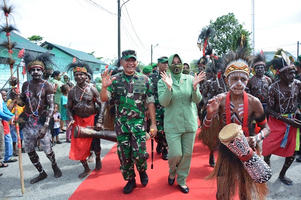 Setibanya di Makodim 1710/Mimika, Danrem 174/ATW Brigjen TNI Bangun Nawoko beserta Ny. Renny Bangun Nawoko disambut tarian adat Suku Kamoro yang diiringi oleh Prajurit dan Persit Kodim 1710/Mimika serta jajar kehormatan.