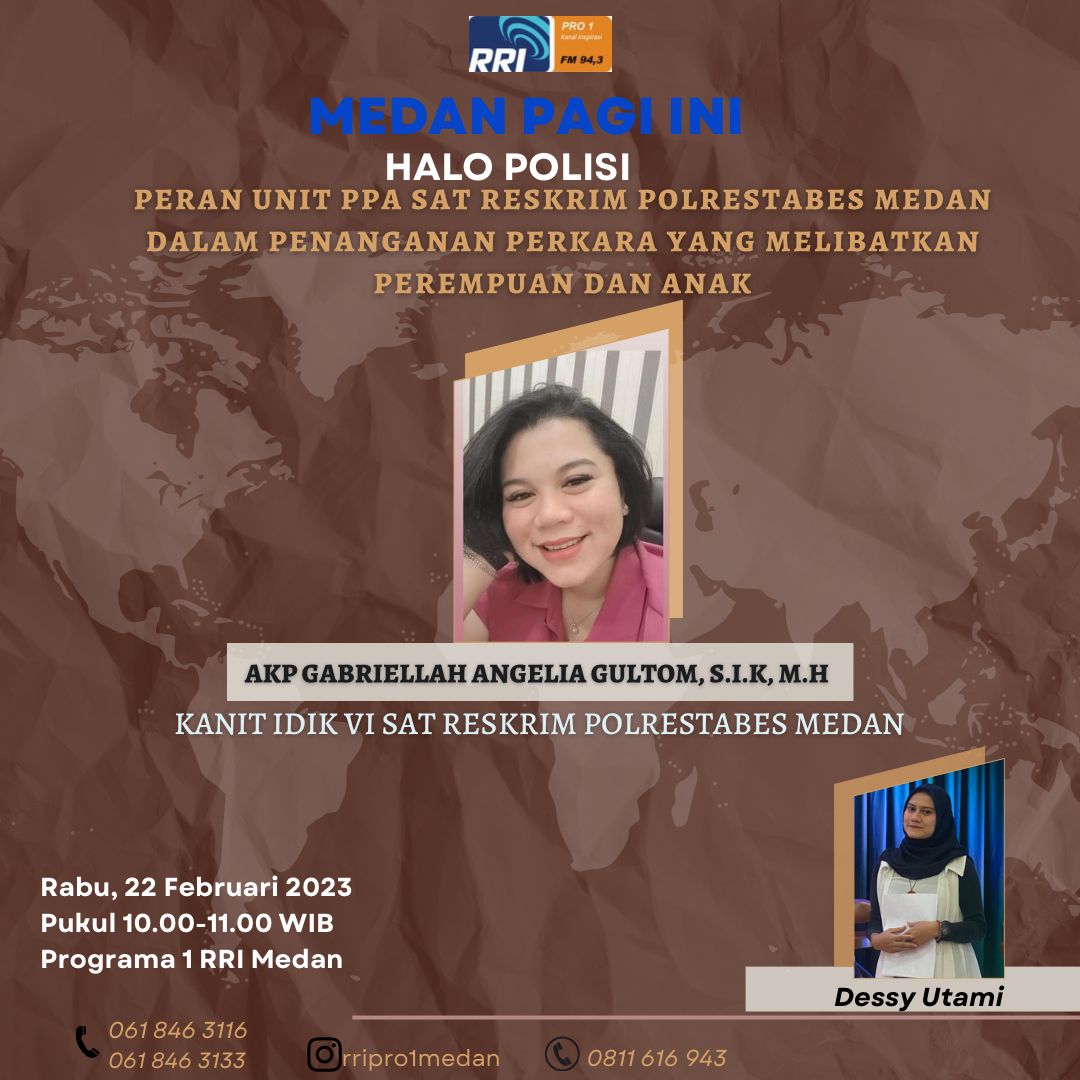 VIRAL24.CO.ID – MEDAN – Dialog interaktif Halo Polisi Polda Sumatera Utara masih tetap bekerjasama dengan RRI Medan, di channel 94,3 FM Pro 1, Jalan Gatot Subroto No. 214 Medan dengan mengambil topik, “Peran Unit PPA Sat Reskrim Polrestabes Medan dalam penanganan perkara melibatkan Perempuan dan Anak,” pada hari Rabu, 22 Februari 2023, sekitar pukul 10.00 WIB hingga selesai.