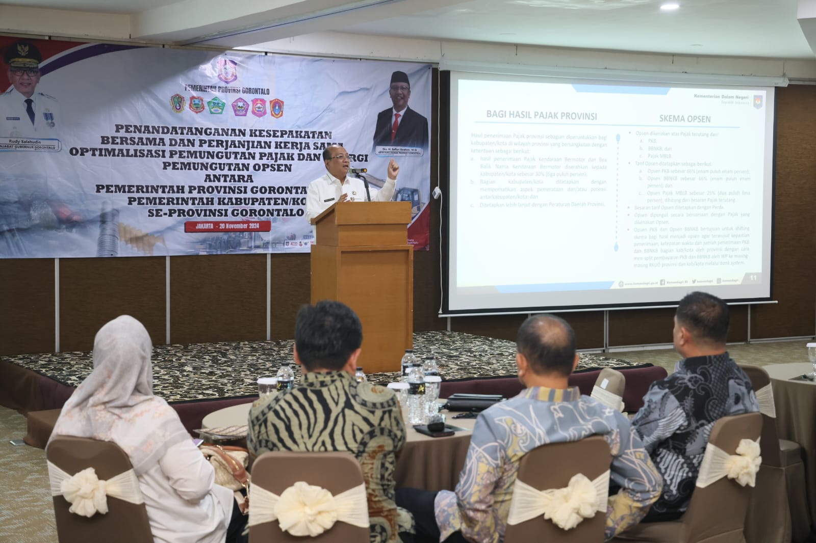 Dorongan ini disampaikan Pelaksana Harian (Plh.) Direktur Jenderal (Dirjen) Bina Keuda Kemendagri Horas Maurits Panjaitan dalam acara Penandatanganan Kesepakatan Bersama dan Perjanjian Kerja Sama Sinergi antara Pemerintah Provinsi dan Kabupaten/Kota dalam Rangka Pemungutan Opsen dan Sinergi Pendanaan yang berlangsung di Hotel Gren Alia Jakarta, Rabu (20/11/2024).