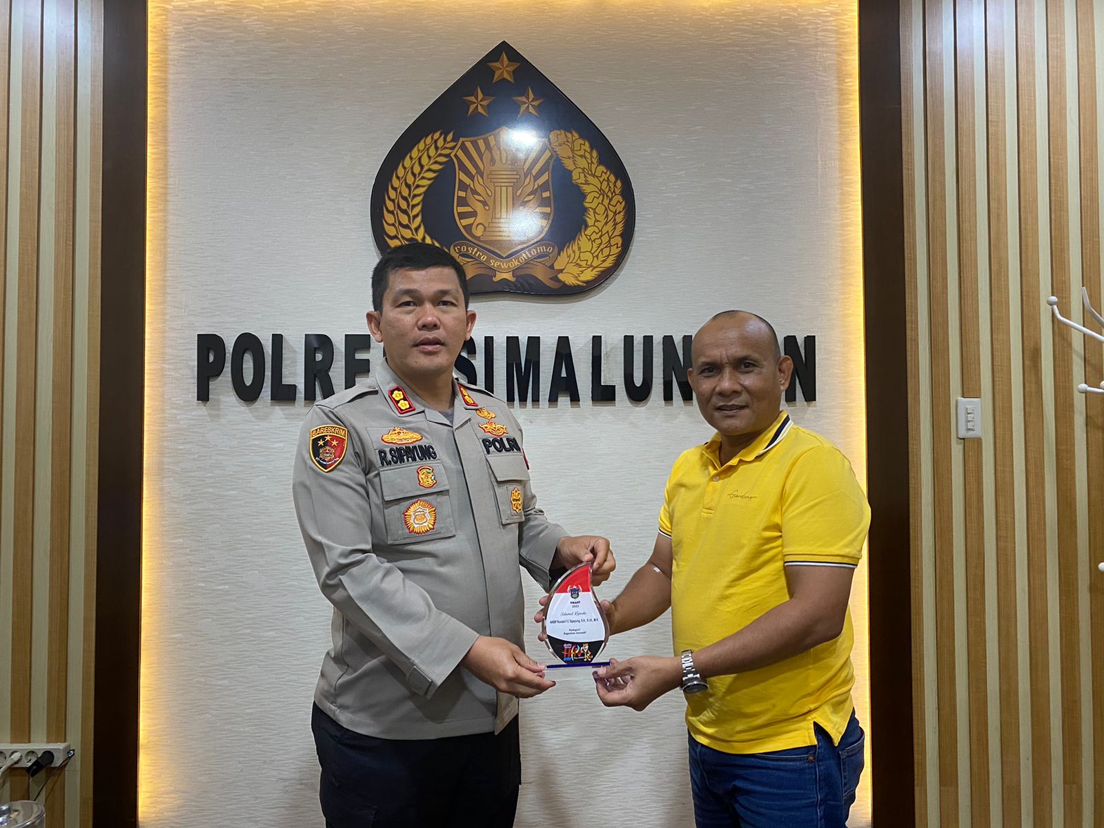 Kapolres Simalungun AKBP Ronald F.C Sipayung SIK SH MH dinobatkan sebagai Kapolres Inovatif. Plakat penghargaan diserahkan langsung oleh Ketua FWP Zulkifli Tanjung di Polres Simalungun, Sabtu (11/2/2023).