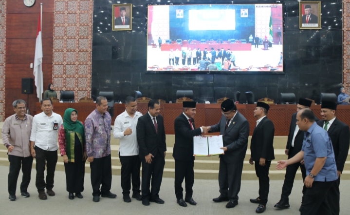 VIRAL24.CO.ID – MEDAN – Gubernur Sumatera Utara (Gubsu) Edy Rahmayadi bersama DPRD Sumut menandatangani persetujuan bersama Rancangan Peraturan Daerah (Ranperda) Anggaran Pendapatan dan Belanja Daerah (APBD) tahun anggaran 2024, di Gedung Paripurna DPRD Sumut Jalan Imam Bonjol Medan, Jumat (28/7/2023).