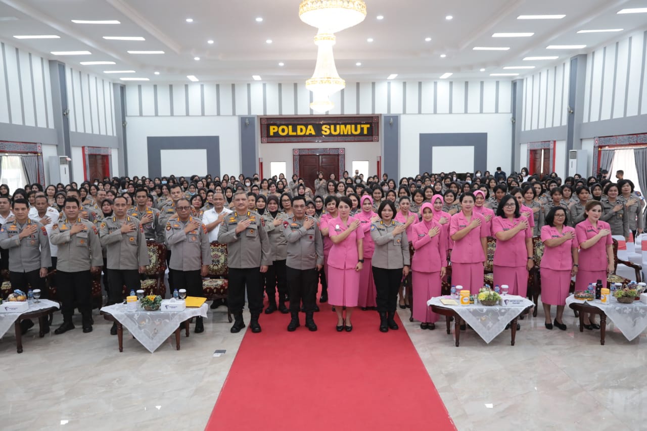 Kapolda Sumut Irjen Pol. Drs. R. Z. Panca Putra S., M.Si bersama Ketua Bhayangkari Daerah Sumut sekaligus Ibu Asuh Polwan Polda Sumut Ny. Rita Panca hadir untuk memberikan arahan.