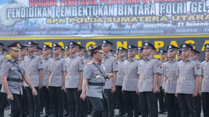 VIRAL24.CO.ID – HINAI – Kapolda Sumut Irjen Pol RZ. Panca Putra Simanjuntak memimpin upacara penutupan, pelantikan dan pengambilan Sumpah Pendidikan Pembentukan Bintara Polri Tahun 2022, di Lapangan Upacara SPN Hinai Polda Sumut, Kabupaten Langkat, Rabu (21/12/2022) pagi.