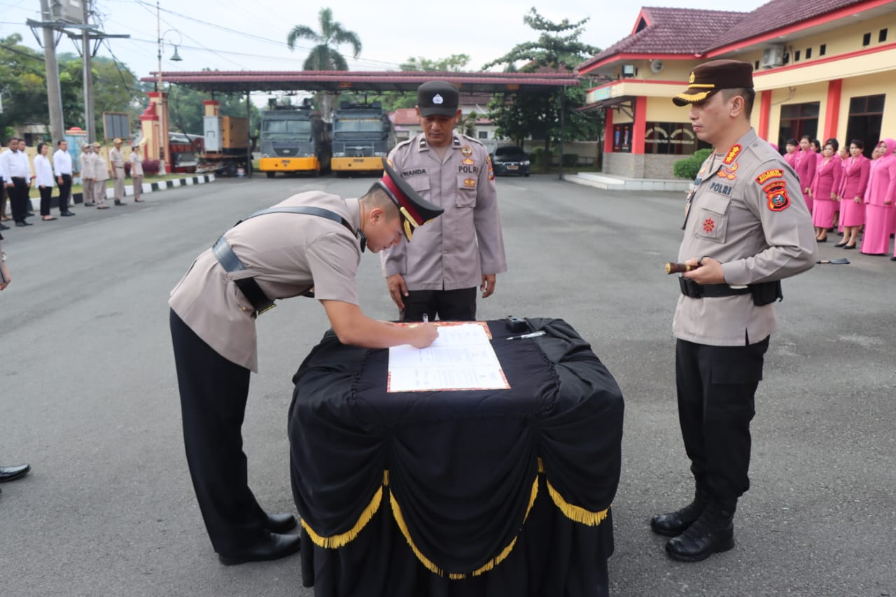 Selanjutnya para pejabat yang serah terima diambil sumpah jabatan di hadapan peserta yang ada dan melakukan penandatangan fakta integritas di hadapan Kapolresta Deli Serdang Kombes Pol Irsan Sinuhaji, SIK, MH. (V24/MA)