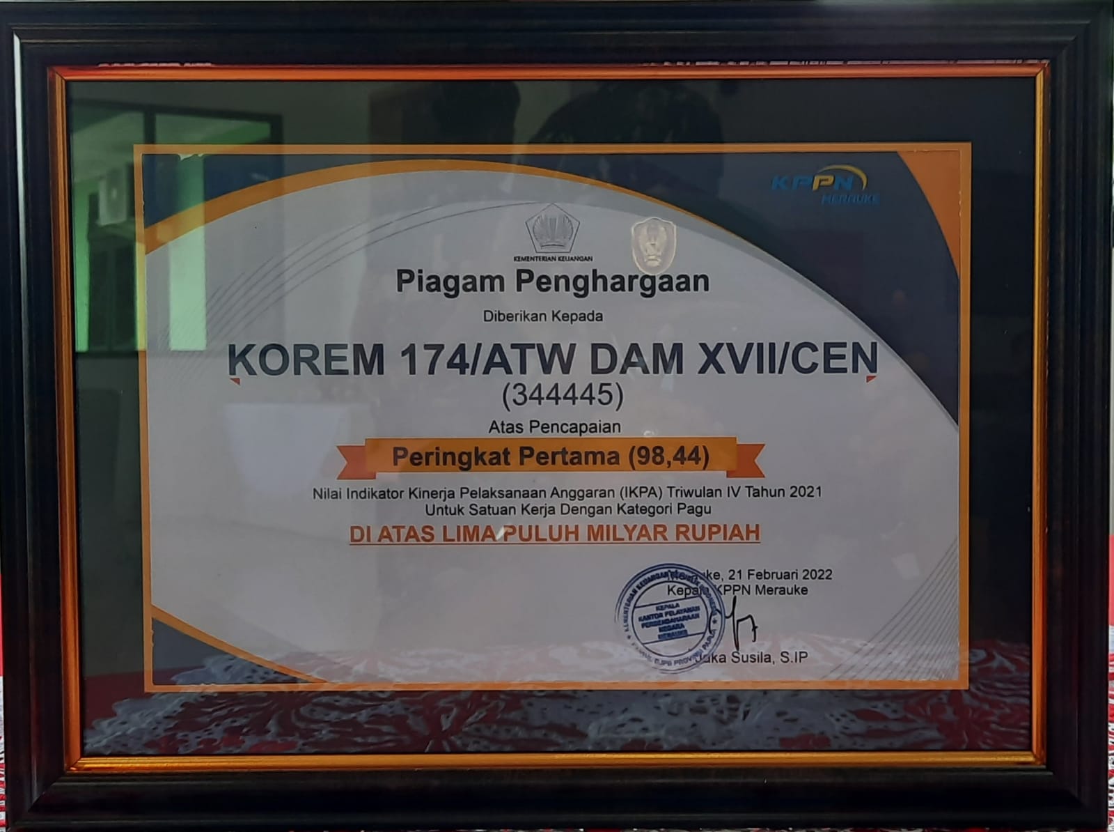 Danrem 174/ATW Brigjen TNI E. Reza Pahlevi, S.E menerima secara langsung Piagam Penghargaan Peringkat Pertama Nilai IKPA TA. 2021 dari Kepala Kantor Pelayanan Perbendaharaan Negara (KPPN) Kabupaten Merauke Jaka Susila, S.I.P, bertempat di Aula L.B. Moerdani Makorem 174/ATW Jalan Poros Tanah Miring, Kab. Merauke, Papua, Selasa (22/02/2022).