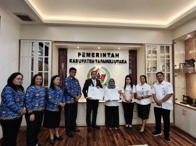 VIRAL24.CO.ID – TAPANULI UTARA – Bupati Tapanuli Utara, Dr. Jonius Taripar Parsaoran Hutabarat, S.Si., M.Si., bersama Kepala BPJS Kesehatan Cabang Sibolga, Nur Eva Parindury, melaksanakan penandatanganan Rencana Kerja (RK) tentang Penyelenggaraan Jaminan Kesehatan Nasional bagi peserta Pekerja Bukan Penerima Upah (PBPU) dan Bukan Pekerja (BP). Kegiatan tersebut berlangsung di Ruang Kerja Bupati, Kantor Bupati Taput-Tarutung, Senin (17/11/2025).