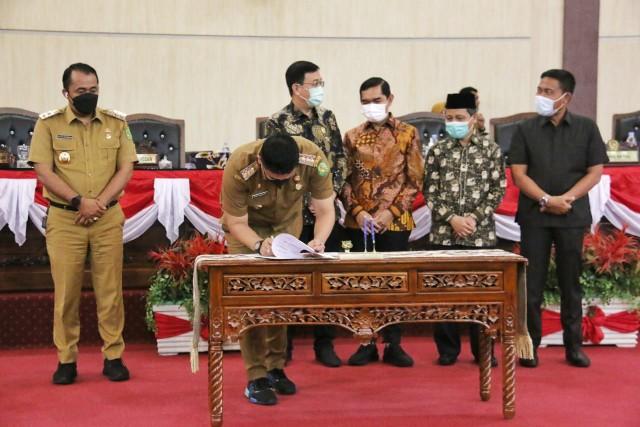 VIRAL24.CO.ID – MEDAN – Pemko Medan dan DPRD Medan menyetujui pembentukan ranperda tentang penyelenggaraan perpustakaan untuk dijadikan sebagai peraturan daerah (Perda). Persetujuan bersama tersebut usai dilakukan penandatanganan dan pengambilan keputusan bersama antara Wali Kota Medan, Bobby Nasution didampingi Wakil Wali Kota Medan, H. Aulia Rachman dengan pimpinan DPRD Medan melalui sidang Paripurna DPRD Medan yang digelar di Gedung DPRD Medan, Senin (27/12/2021).
