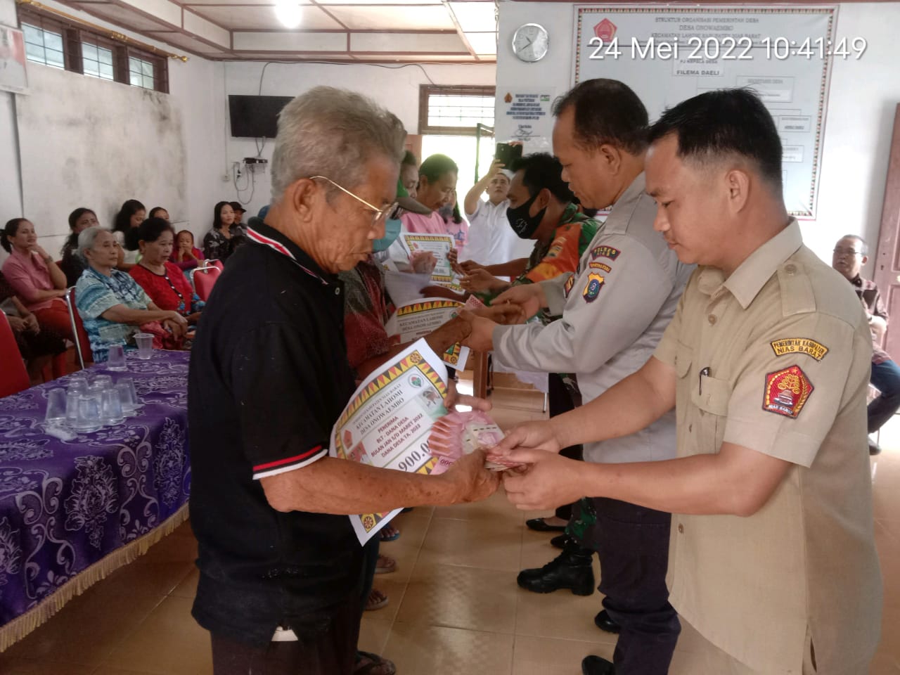 VIRAL24.CO.ID – NIAS – Personil Polsek Sirombu Polres Nias Aiptu Riskon Ginting yang juga sebagai Kapolsub Sektor Lahomi Polsek Sirombu, menghadiri sekaligus monitoring kegiatan penyaluran Bantuan Langsung Tunai Dana Desa (BLT-DD) Tahun 2022 yang dilaksanakan di Balai Desa Onowaembo Kecamatan Lahomi Kabupaten Nias Barat, Selasa (24/05/2022).