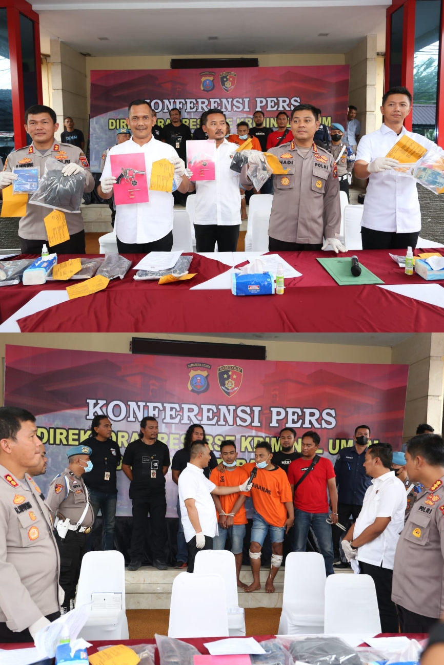 MEDAN – Tim Dit Reskrimum Polda Sumut bersama Polres Simalungun merilis kasus perampokan menggunakan senjata api rakitan terhadap pengusaha sawit di Dusun Huta VI Nagori, Kecamatan Ujung Padang, Kabupaten Simalungun, bertempat di depan gedung Ditreskrimum Polda Sumut, Medan, Kamis (09/03/2023).