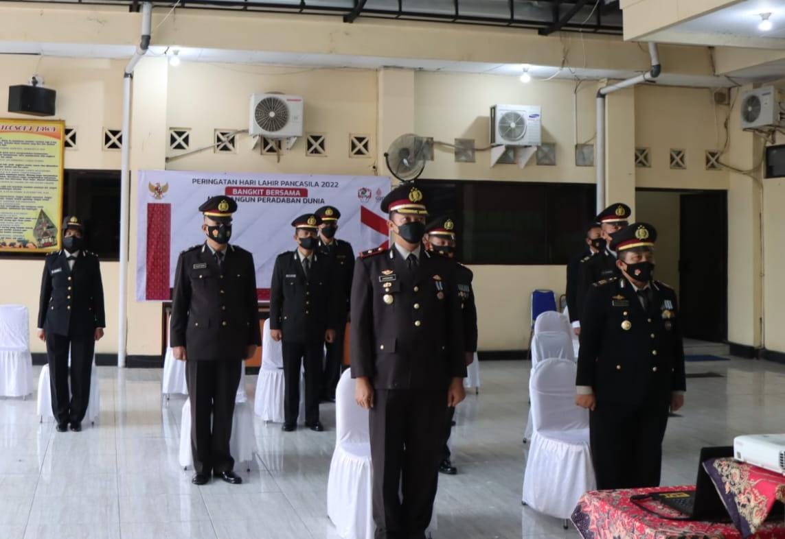 VIRAL24.CO.ID – PEKALONGAN KOTA – Kepolisian Resor Pekalongan Kota, Polda Jateng mengikuti upacara Hari Lahir Pancasila 1 Juni 2022 secara virtual sesuai instruksi dari Pemerintah Pusat. Acara itu digelar di serambi Mapolres Pekalongan Kota. dan diruang masing masing Bagian, Satuan, Seksi dan Polsek Jajaran, Rabu (01/06/2022).