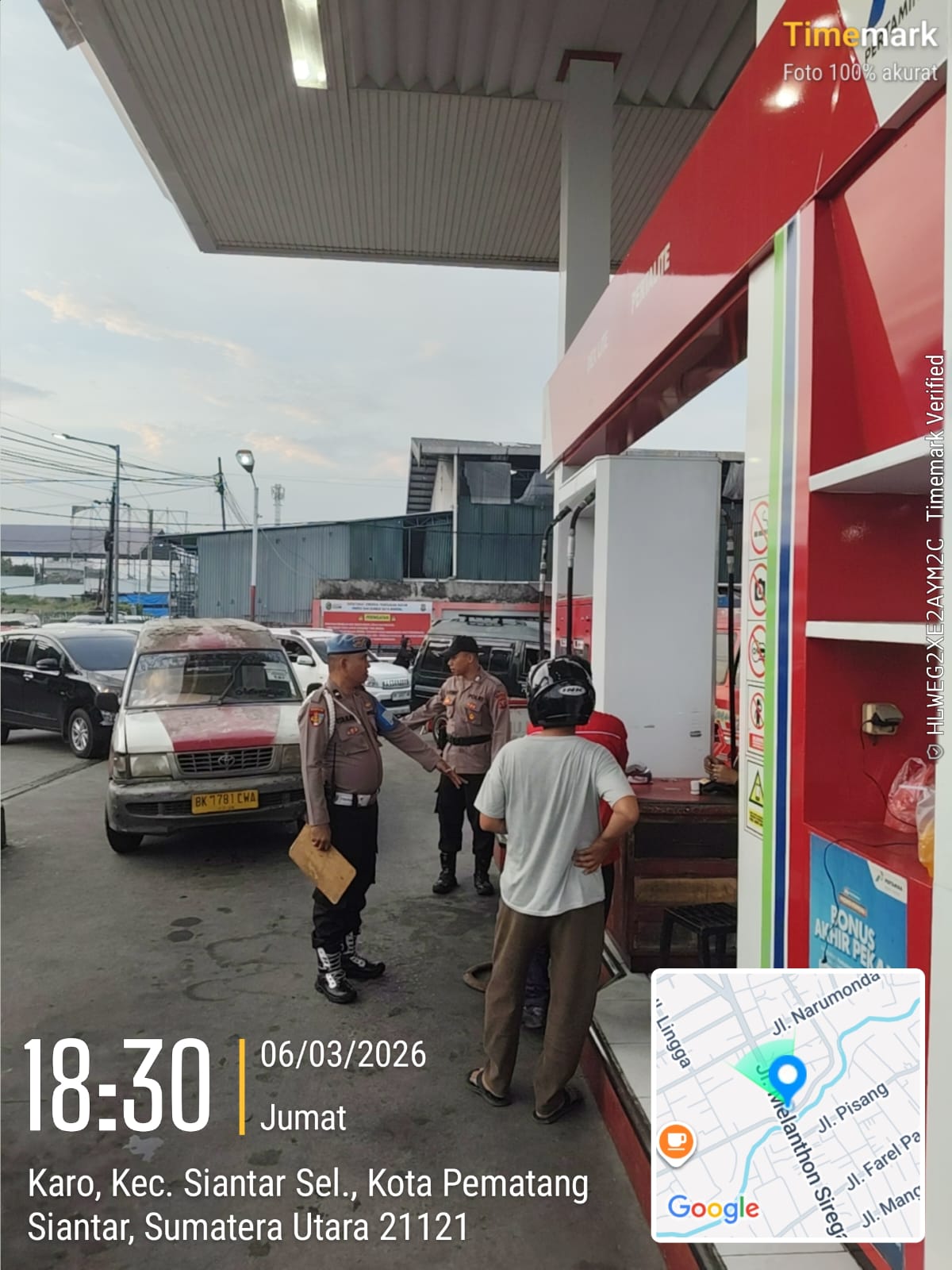 VIRAL24.CO.ID – PEMATANGSIANTAR – Polres Pematangsiantar melalui Polsek Siantar Selatan melakukan monitoring pengisian atau penyaluran bahan bakar minyak (BBM) di SPBU Nomor 14.211.201 yang berada di Jalan Melanthon Siregar, Kelurahan Karo, Kecamatan Siantar Utara, Kota Pematangsiantar, Jumat (6/3/2026) sekitar pukul 18.30 WIB.