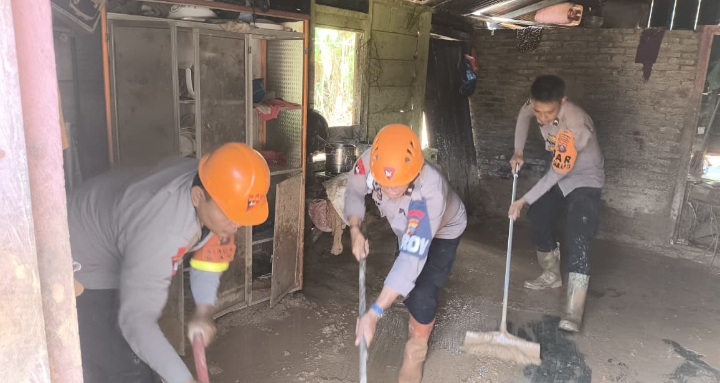 Tidak hanya membersihkan jalan, personel Brimob juga turun membantu warga membersihkan rumah yang masih dipenuhi lumpur. Proses ini dilakukan secara manual dengan alat SAR yang dibawa dari markas penugasan.