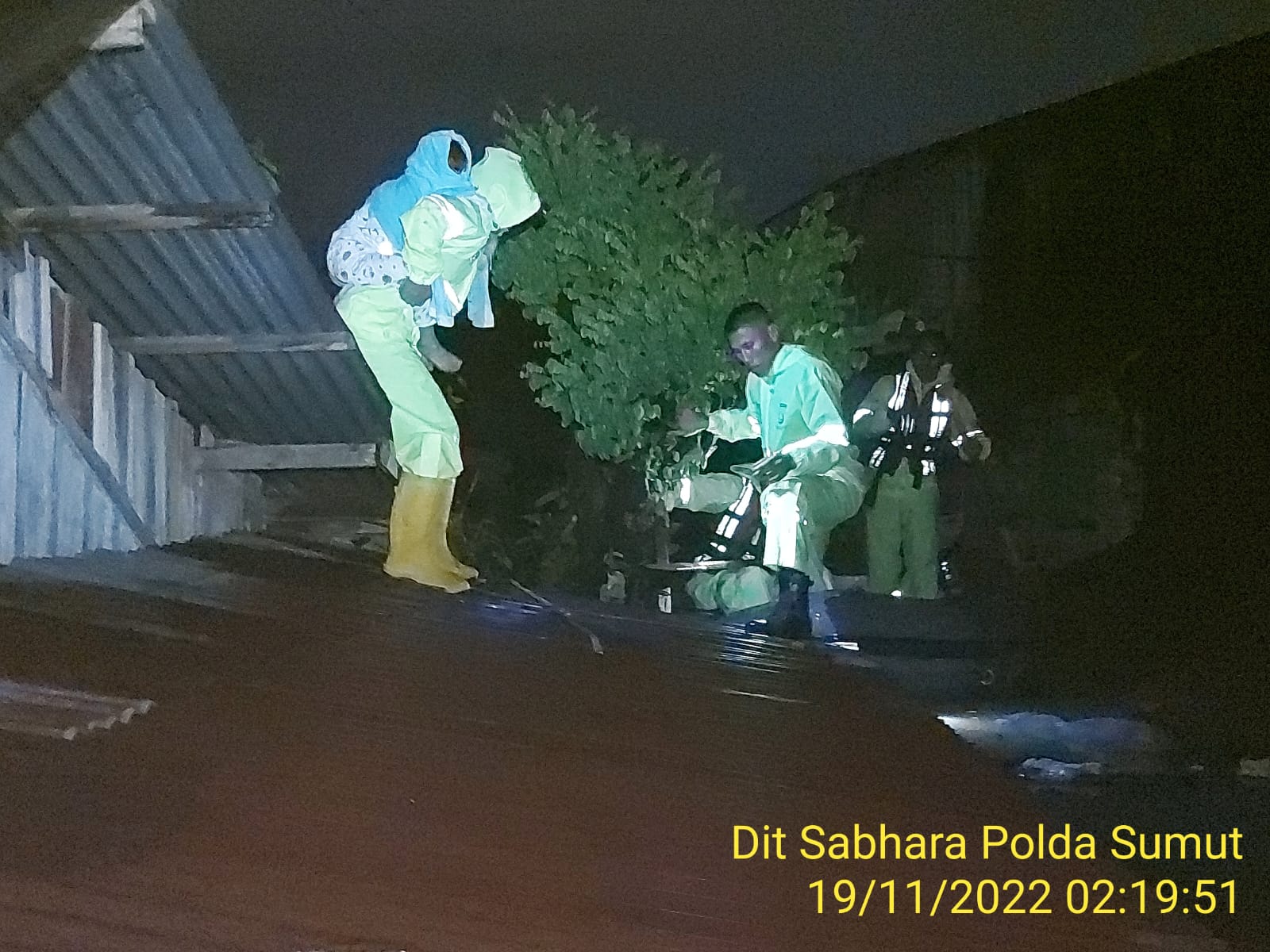 Kabid humas Polda Sumut saat dikonfirmasi Dini hari mengatakan Sedikitnya 60 anggota Shabara dari Polda Sumut berpakaian mantel hujan dan Personil Polrestabes sudah berada di beberapa Titik Lokasi banjir.