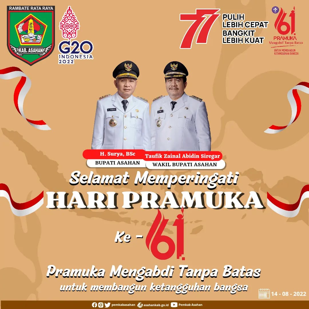 Pemerintah Kabupaten Asahan mengucapkan “Selamat Hari Pramuka 2022. Terus lahirkan tunas-tunas muda yang selalu terdepan dalam berikan solusi bangsa, serta menghadirkan kemajuan baru. Salam Pramuka!”. (Kirun)
