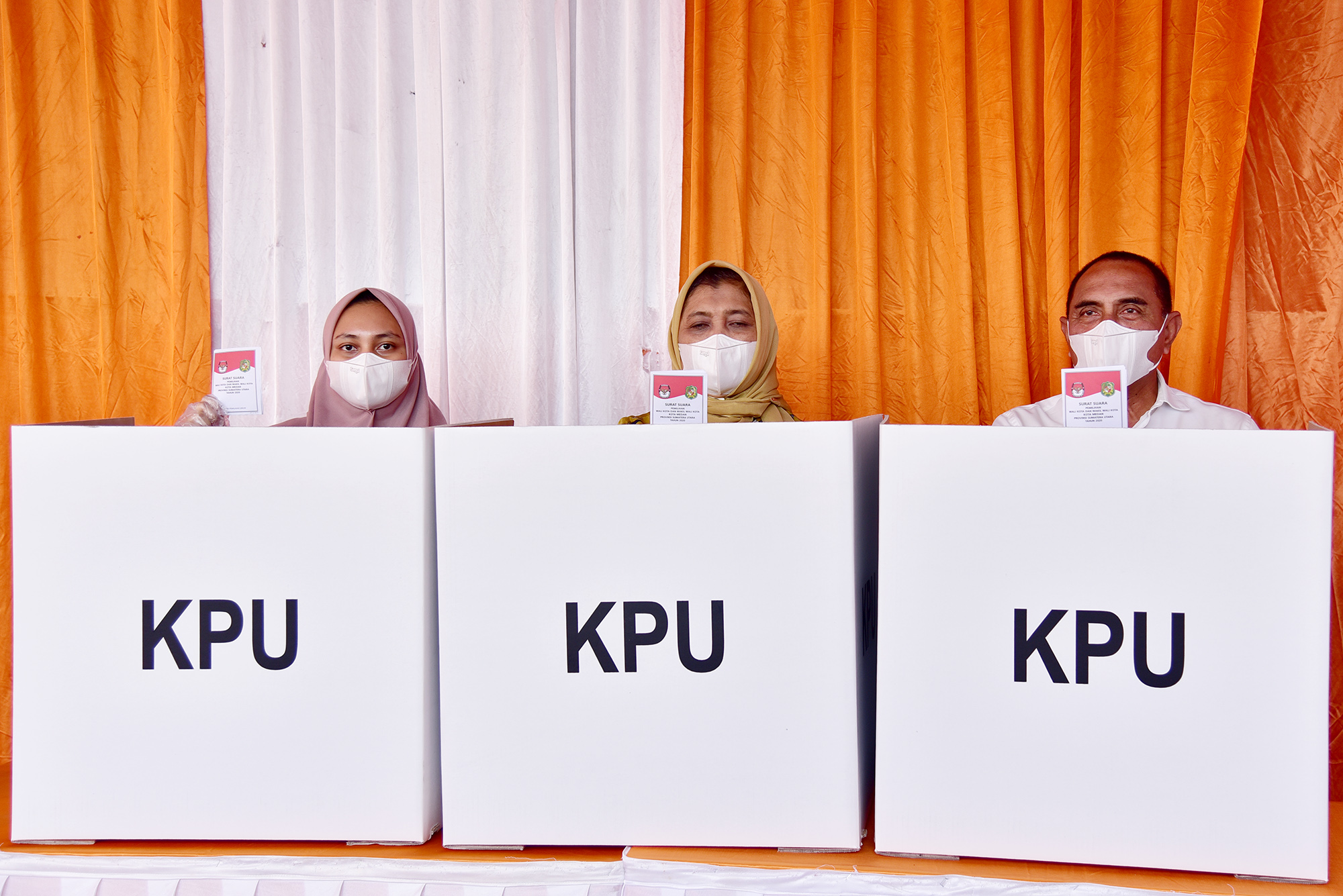 Gubernur Sumut Edy Rahmayadi didampingi Ketua TP PKK Sumut Nawal Edy Rahmayadi dan keluarga menggunakan hak pilihnya dalam Pemilihan Kepala Daerah (Pilkada) Kota Medan, di Tempat Pemungutan Suara (TPS) 23 di Jalan Karya Bakti Johor Medan, Rabu (9/12/2020).