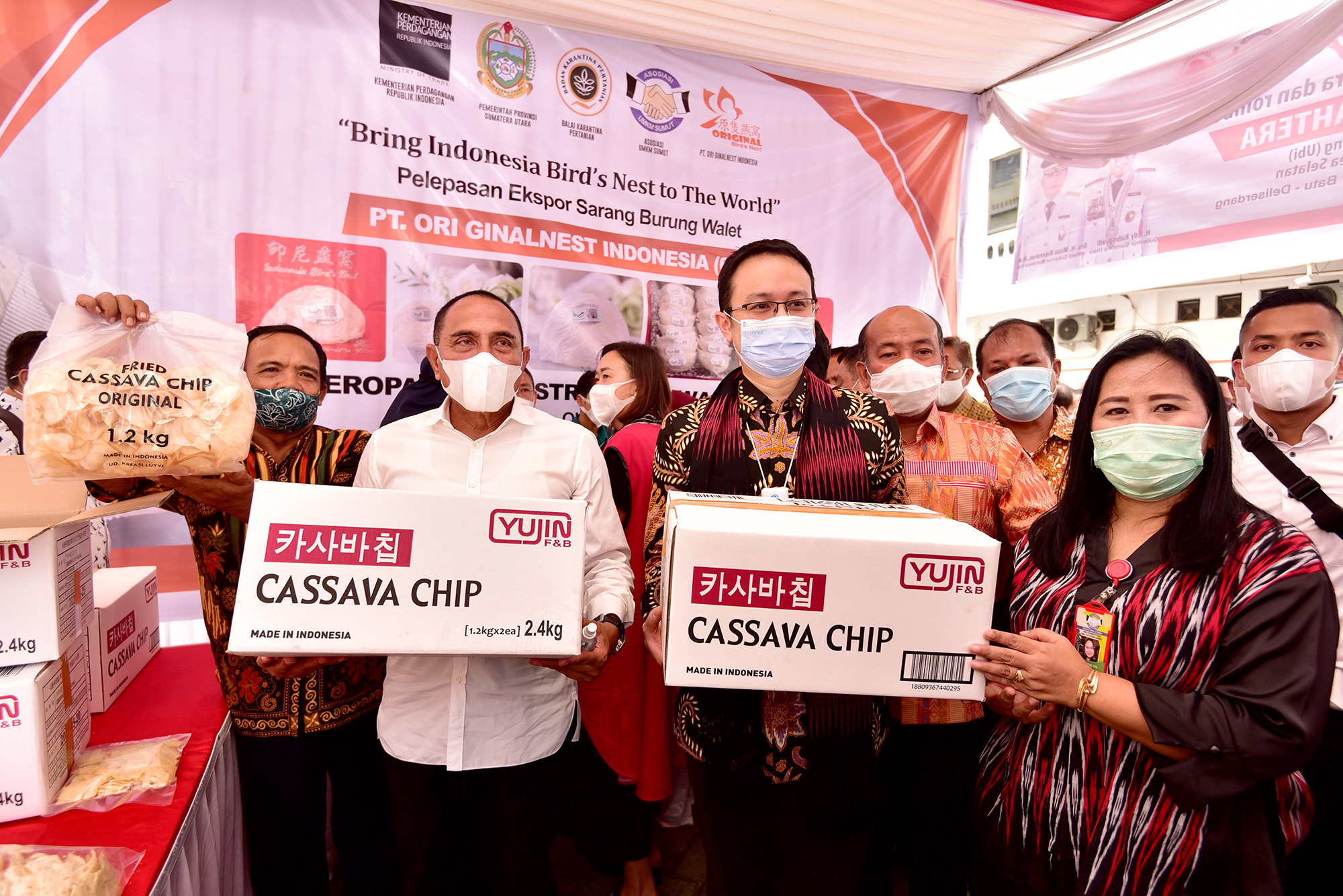 Gubernur Sumut Edy Rahmayadi bersama Wakil Menteri Perdagangan Republik Indonesia Jerry Sambuaga melepas ekspor sarang burung walet dan produk berbasis singkong di Komplek MMTC, Jalan Willem Iskandar, Deli Serdang, Sabtu (7/11/2020).