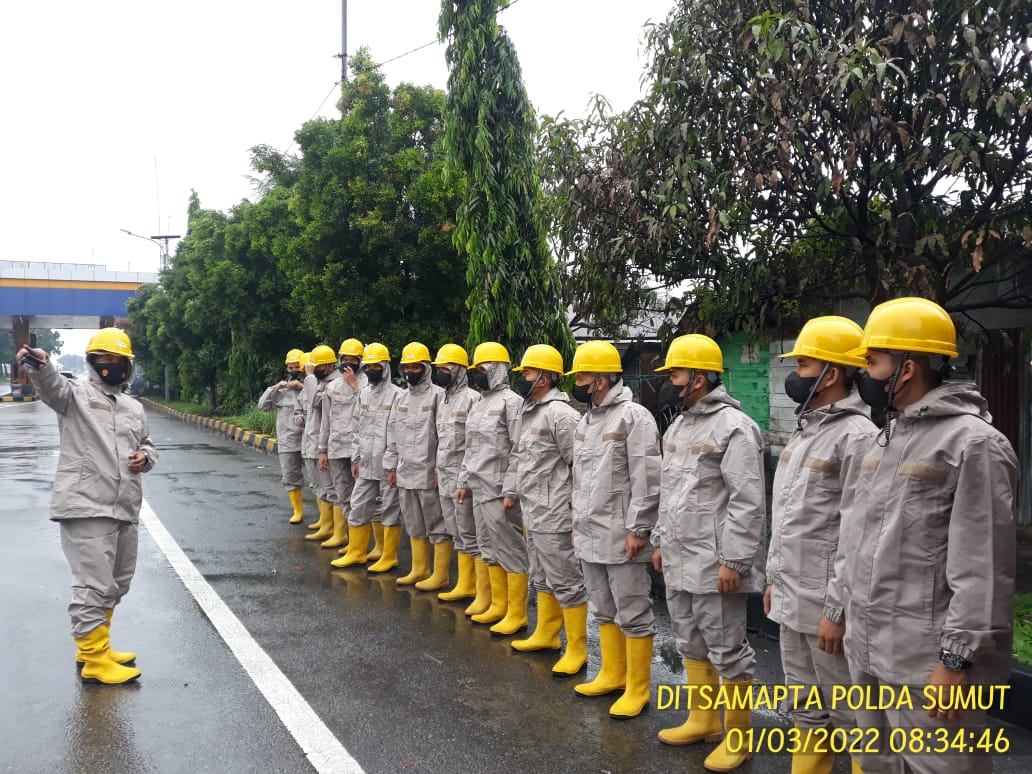 seiring fenomena cuaca yang terjadi terkait intensitas hujan di wilayah hukum Polrestabes Medan, personil Dit Samapta Polda Sumut pun di siagakan.