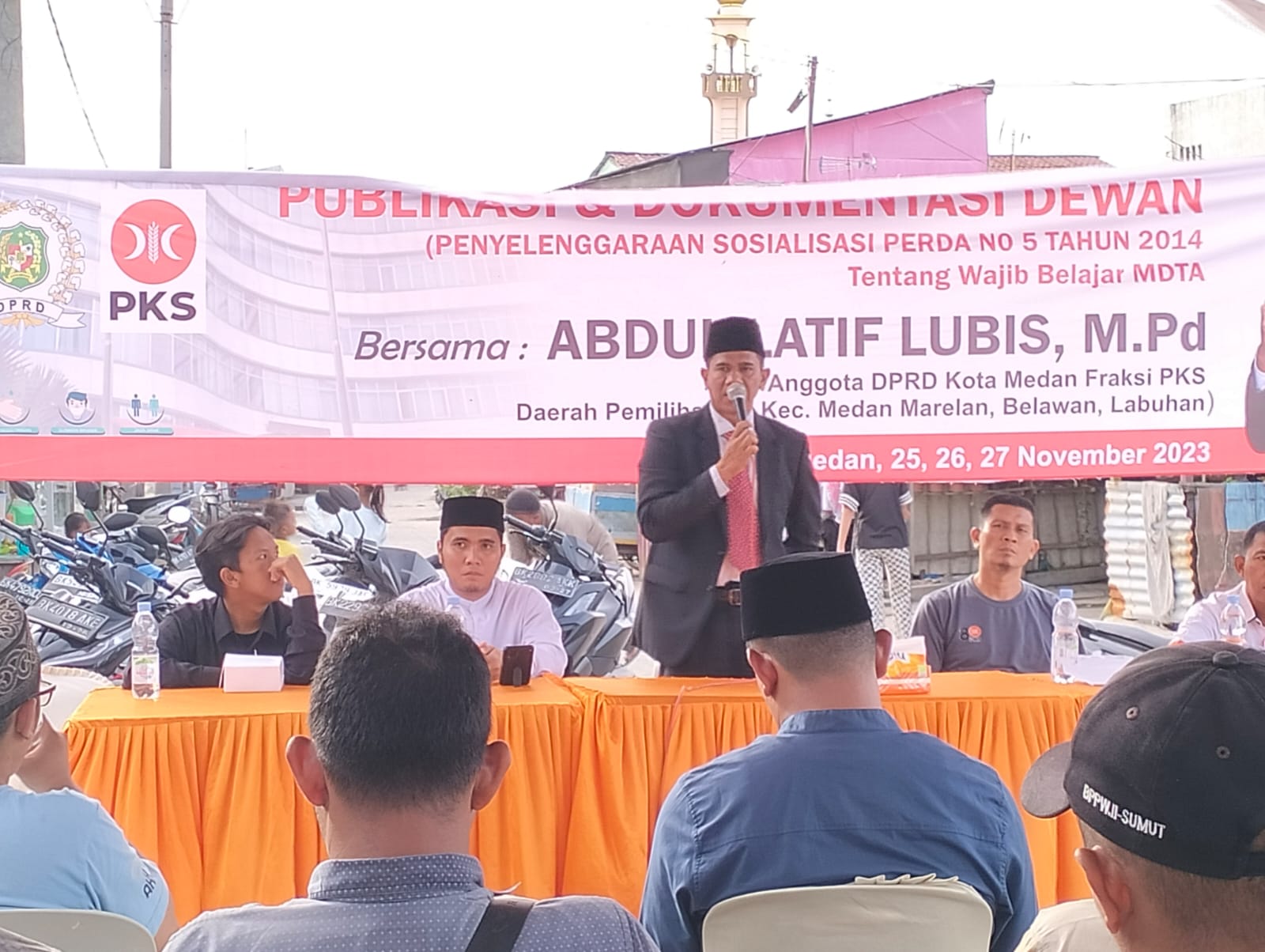 VIRAL24.CO.ID – MEDAN – Anggota DPRD Medan dari Fraksi PKS Abdul Latif Lubis M. Pd melakukan Sosialisasi Peraturan Daerah (Sosper) No. 5 tahun 2014 tentang wajib belajar Madrasah Diniyah Takmiliyah Awaliah (MDTA). Dalam sosialisasinya, Latif mengajak warga Kota Medan agar mendukung Perda No. 5 tahun 2014 dapat terealisasi.
