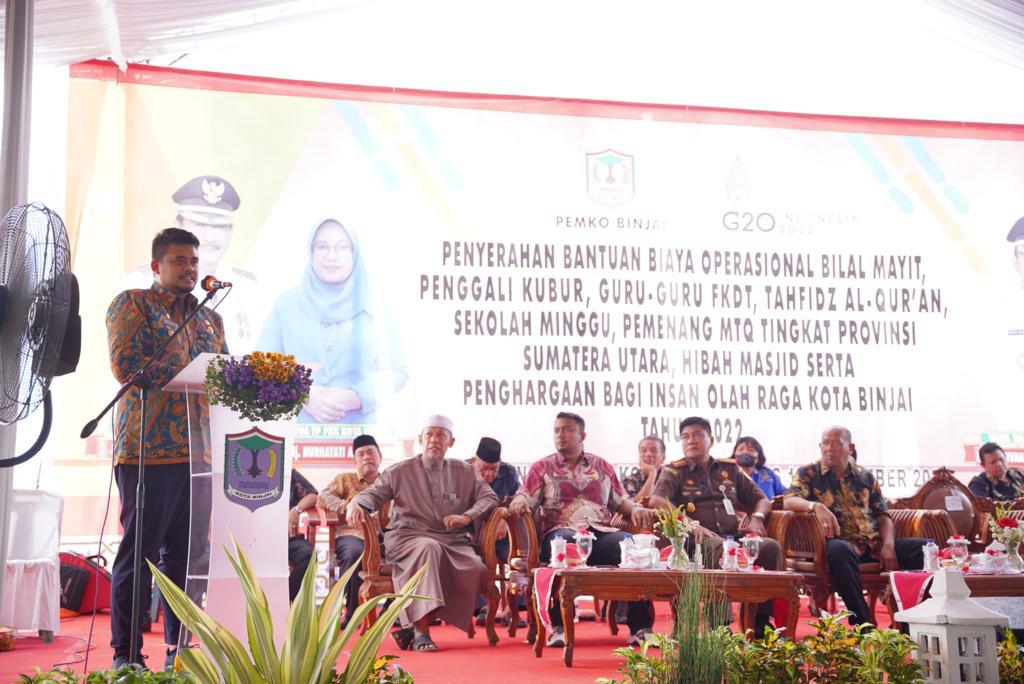 VIRAL24.CO.ID – MEDAN – Wali Kota Medan Bobby Nasution selaku Ketua Komisariat Wilayah (Komwil) I Asosiasi Pemerintah Kota Seluruh Indonesia (APEKSI) menyerahkan bantuan biaya operasional kepada 820 orang bilal mayit dan penggali kubur, 500 orang guru dari Forum Komunikasi Diniyah Takmiliyah, guru tahfidz Al-Quran dan guru-guru Sekolah Minggu Gereja se Kota Binjai di Lapangan Merdeka Binjai Jalan Sudirman Kota Binjai, Kamis (15/9).